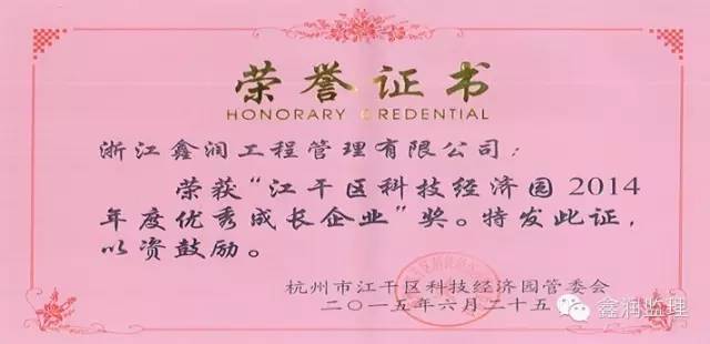 浙江鑫潤工程管理有限公司榮獲“優秀成長企業”稱號